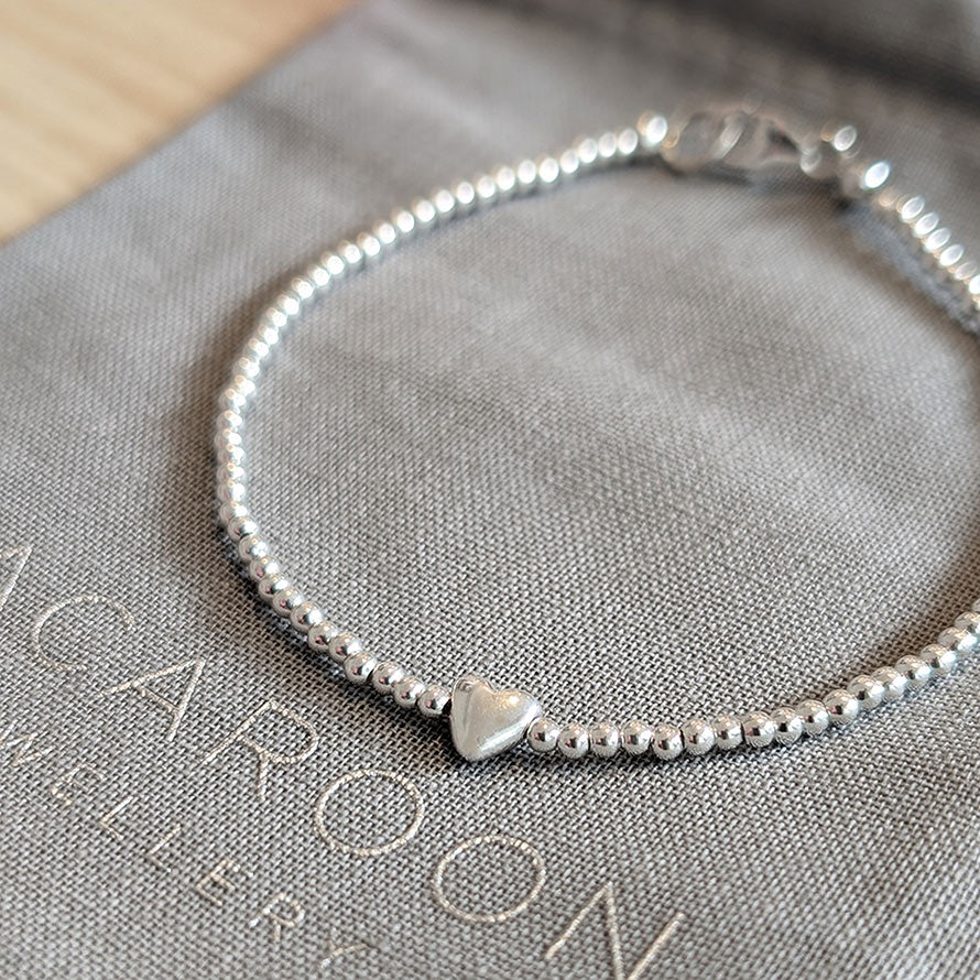 A beautiful sterling silver beaded bracelet with a pretty sterling silver heart charm. Tiny silver beads have been hand thread to make a gorgeous row, and one matte sterling silver heart charm sits at the centre of the bracelet. Finished with a sterling silver lobster clasp fastening.