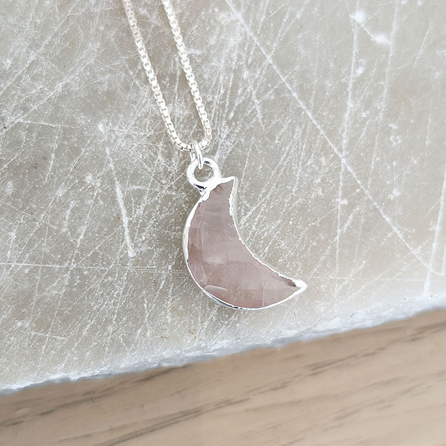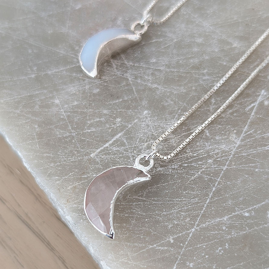 Our stunning collection of semi precious gemstone moon charm necklaces. These charm necklaces have been made with three gorgeous gemstone moon charms in a range of beautiful colours. Each faceted moon is set in sterling silver and hangs from a sterling silver Venetian chain. Available in pretty, soft Rose Quartz, delicate, pale white Agate and vibrant, deep green Onyx.