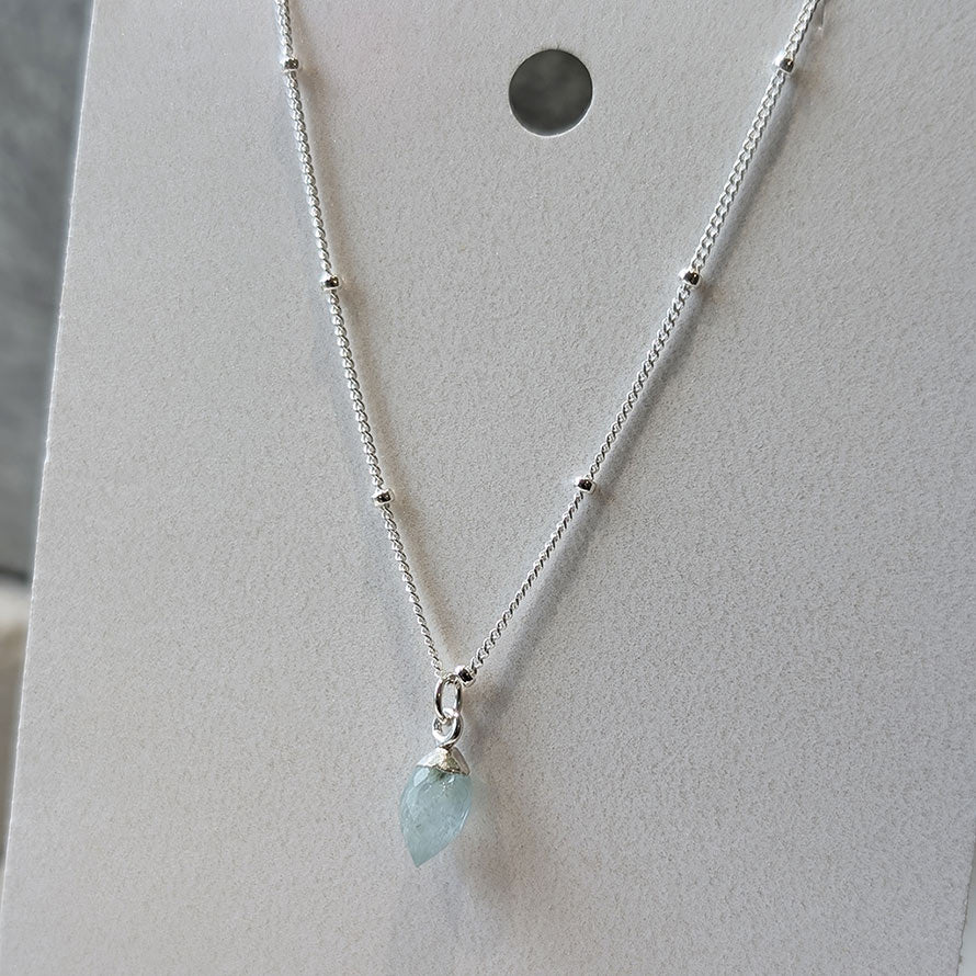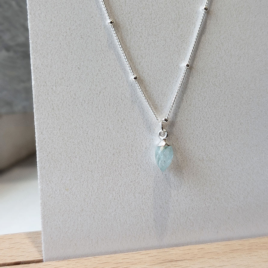 This stunning semi-precious gemstone necklace is made using the most delicate pale blue gemstone. The faceted, marquise Aquamarine semi-precious gemstone drop hangs from a pretty sterling silver satellite chain. As you move, each little facet on the gemstone catches the light and sparkles. Aquamarine is the birthstone for March so this necklace makes a gorgeous birthday gift for a friend or loved one.