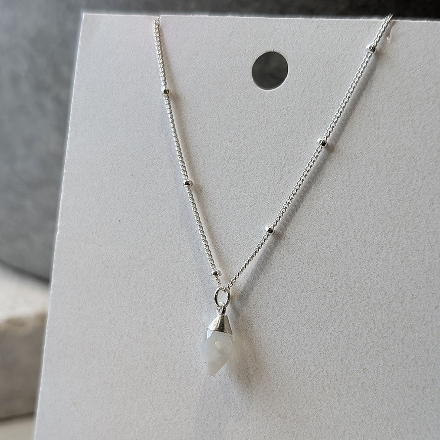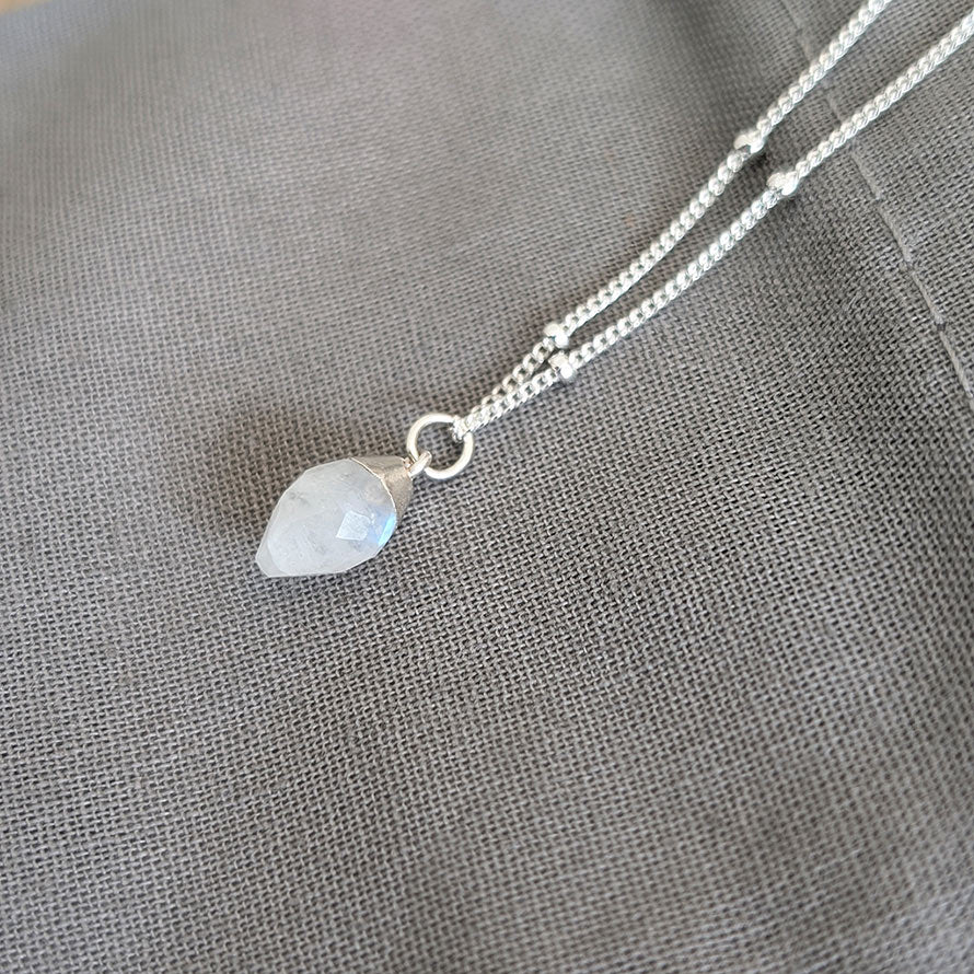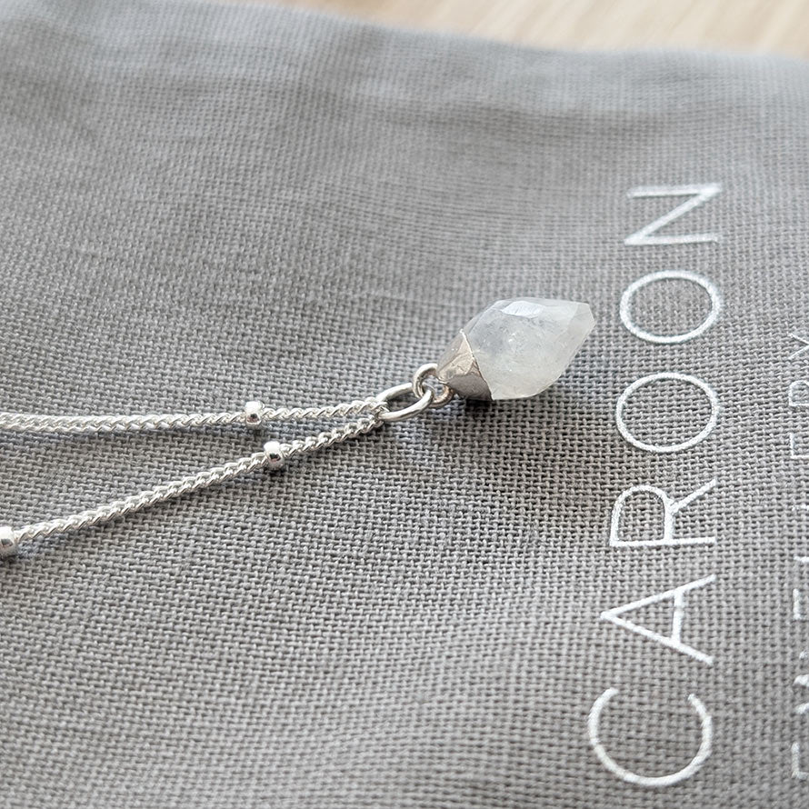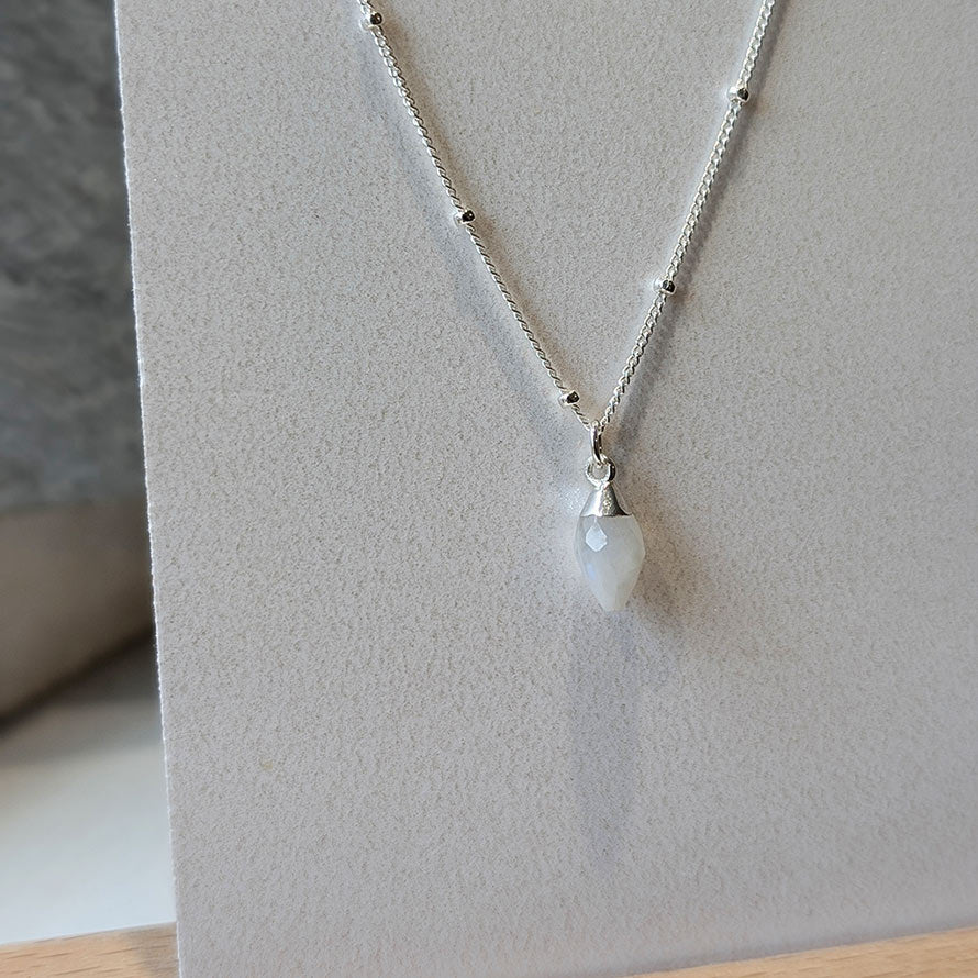 This stunning semi-precious gemstone necklace is made using the most delicate opalescent gemstone. The faceted, marquise Rainbow Moonstone marquise drop hangs from a pretty sterling silver satellite chain. As you move, each little facet on the gemstone catches the light and sparkles. Rainbow Moonstone is such a delicate gemstone in an opalescent white shade which shows occasional iridescent flashes of colour when it moves.