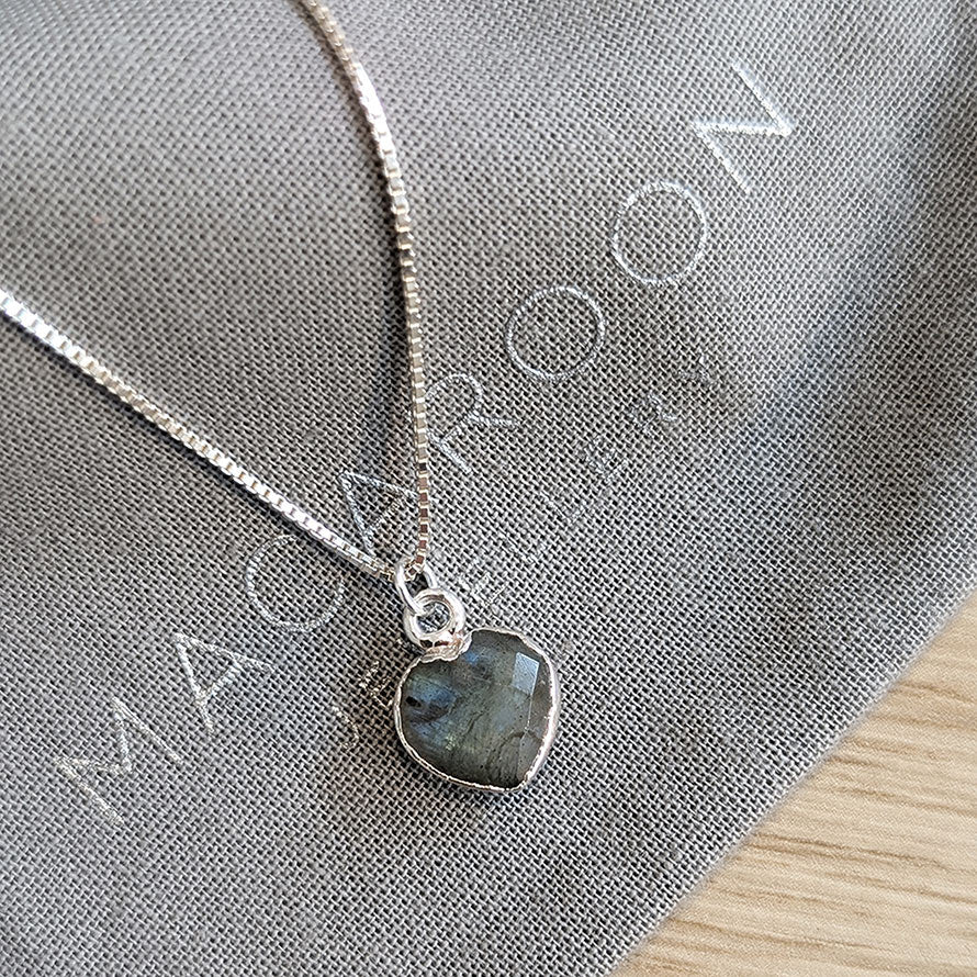 A gorgeous heart shaped, faceted Labradorite semi precious gemstone is set in a sterling silver edging, and hangs from a sterling silver Venetian chain. This delicate dark grey gemstone is double sided so you can see the beautiful irridescent colours of green and blue within the gemstone when it hangs and the facets catch the light.