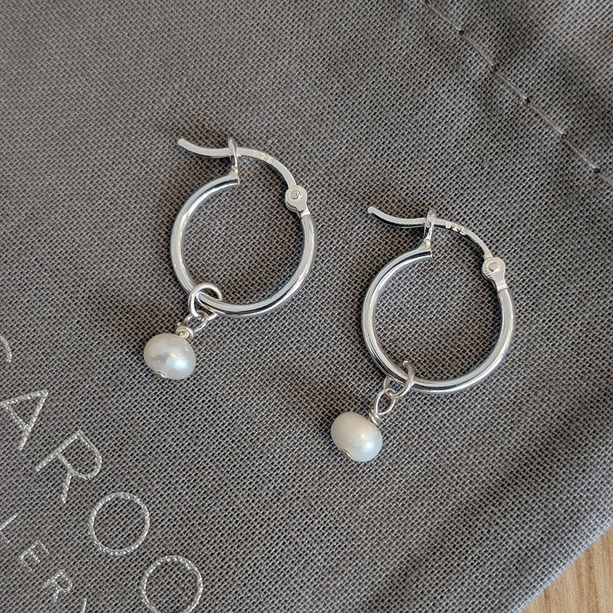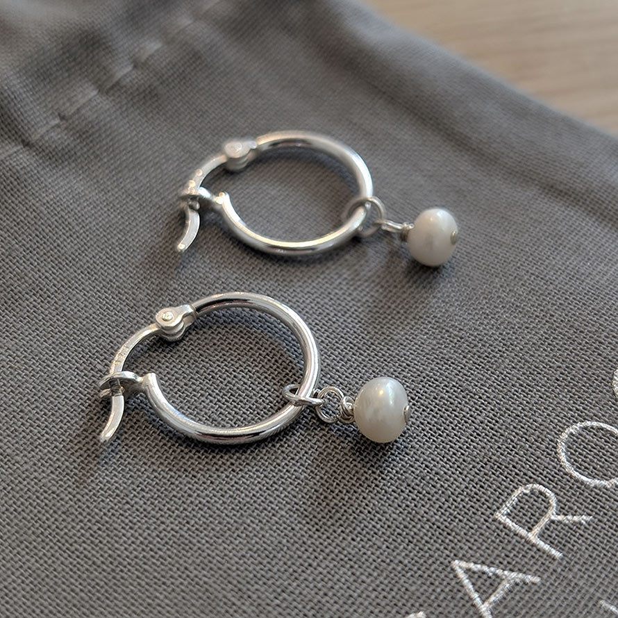 Gorgeous silver hoops with beautiful freshwater pearls. Each natural pearl hangs daintily from a pair of stunning sterling silver hoops with an easy to wear hinged fastening. The perfect hoop earrings to create a classic, stylish outfit.
