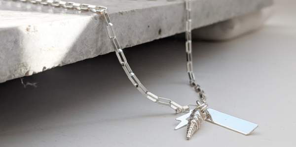 A collection of gorgeous sterling silver necklaces. Made with delicate, shimmering silver chains and feminine charms. Semi-precious gemstones and Swarovski crystals add colour and contrast to subtle silver textures.