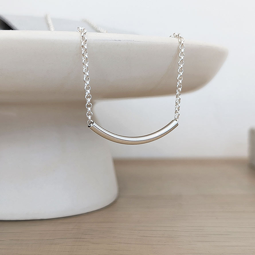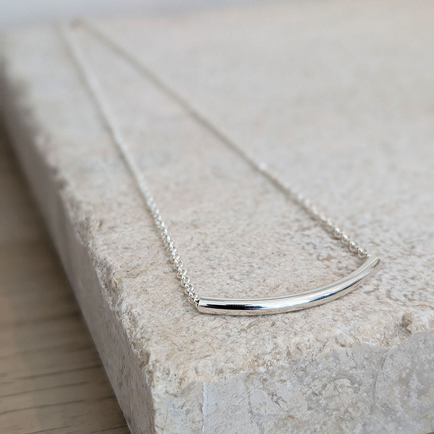 Our new curved bar necklace with a chunky silver tube. This gorgeous, polished sterling silver tube has been thread onto our pretty belcher chain and sits beautifully just below the collar bone. We absolutely love this chic, chunkier version and like to style it with our matching curved bar bracelet.